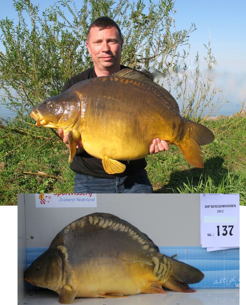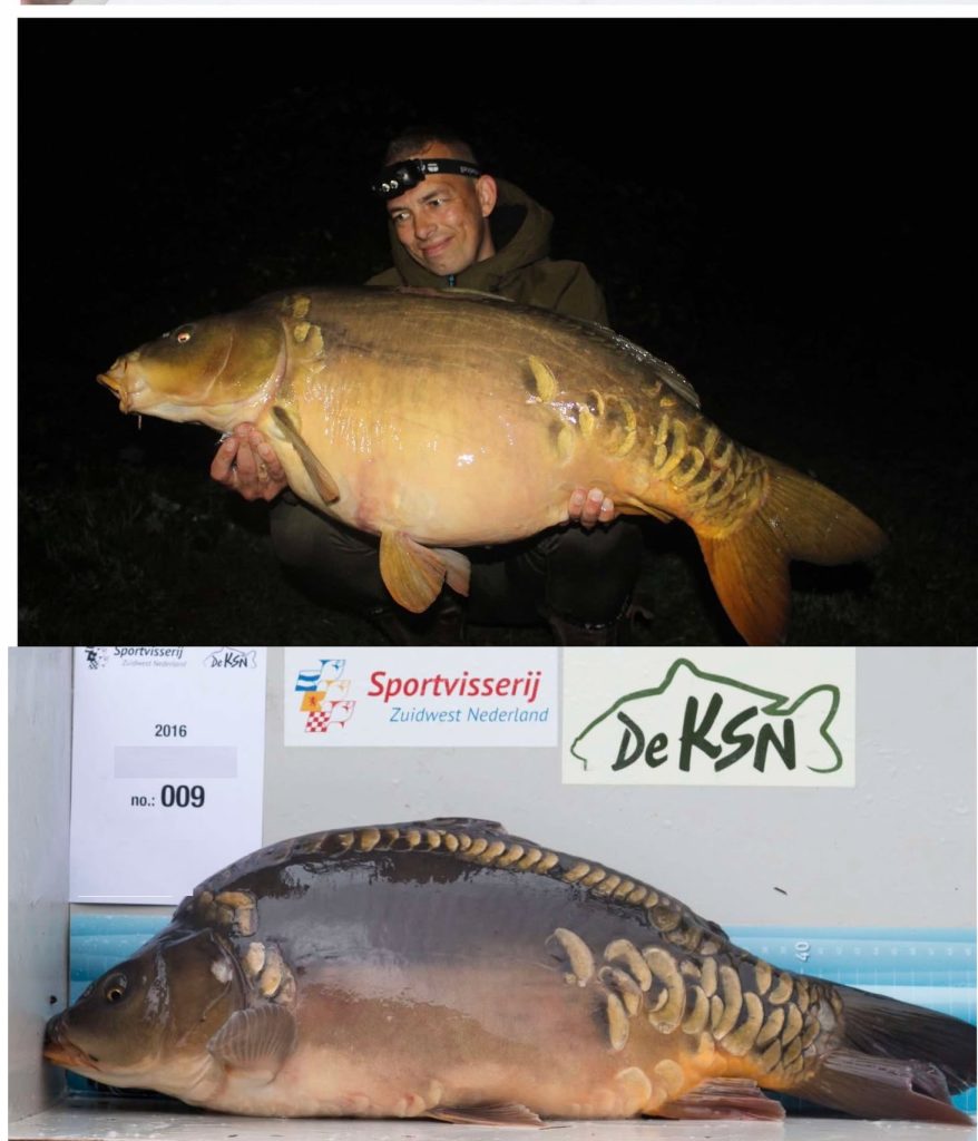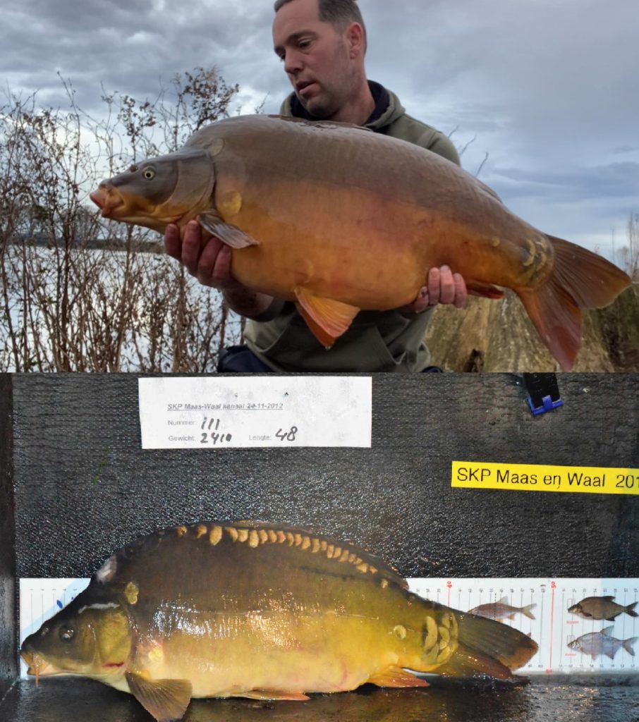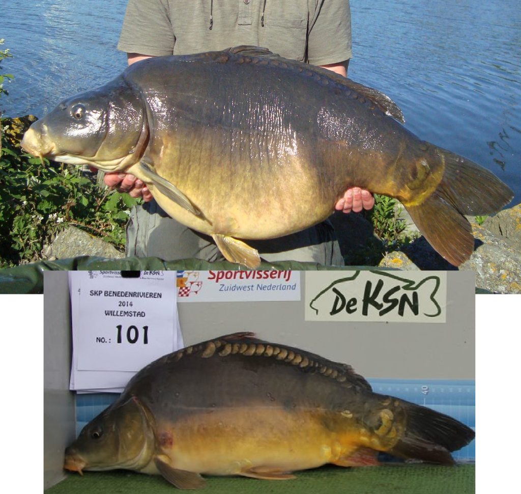 Bennie deed onlangs een vangstmelding van een opvallende spiegelkarper. Na vergelijking met ons archief bleek het om een vis te gaan die we al in 2012 op de plankfoto hadden vastgelegd — een match dus! Wat deze vangst extra bijzonder maakt, is dat er in al die jaren nog niet eerder een melding van deze Peschkes is gedaan. De match levert Bennie een met loodvrij gevulde Korda Basix Tackle box t.w.v. 26,50 op en ons een hoop waardevolle informatie over de groei en migratie van deze bijzondere vis. Win-win!