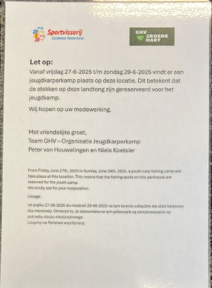 De gereserveerde stekken zijn duidelijk gemarkeerd met informatiebladen zoals onderstaand voorbeeld. Wij vragen alle sportvissers om hier rekening mee te houden.