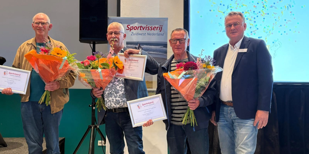 Alle vier werden verkozen tot vrijwilliger van het jaar! Degenen die op de ALV van 27 mei aanwezig waren, werden daar door Paul van Keulen, voorzitter van Sportvisserij Zuidwest Nederland, in het zonnetje gezet.