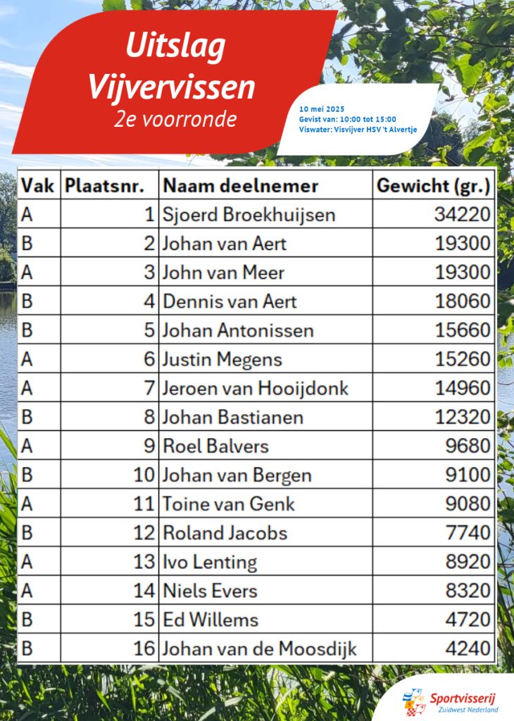 Uitslag 2e voorronde ONK Vijvervissen – ’t Alvertje